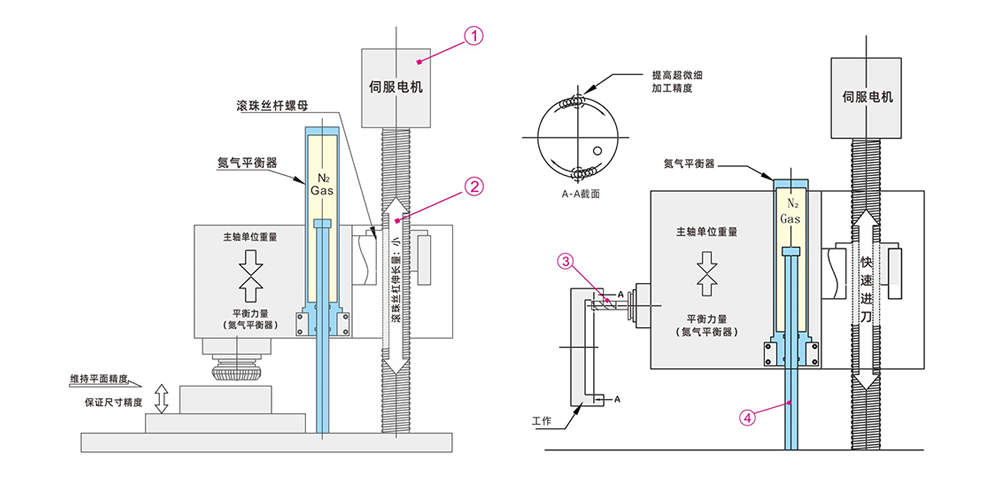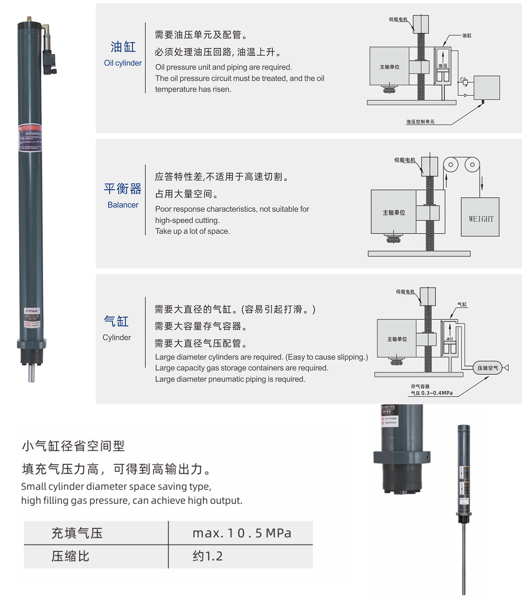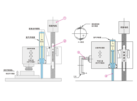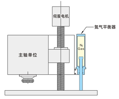 ① 減輕伺服電機(jī)負(fù)荷,降低電力消耗和發(fā)熱。在無平衡器的情況下,只靠伺服電機(jī)對主軸單元進(jìn)行升降及位置保持,電機(jī)負(fù)荷過大,電力消耗量增加。另外,由于電機(jī)發(fā)熱,滾珠絲杠變長,影響位置精度。利用氮?dú)馄胶馄髌渲亓?,可減輕伺服電機(jī)負(fù)荷,降低電力消耗和發(fā)熱。